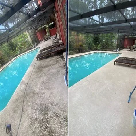 We provide professional pool deck and surface cleaning to keep your outdoor oasis safe, beautiful, and ready to enjoy. Over time, pools and surrounding areas can collect dirt, algae, mildew, and calcium deposits — making them slippery, stained, and unsightly.